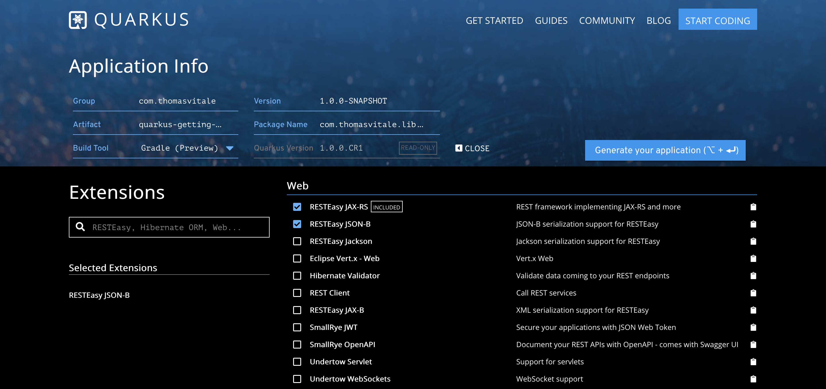 -Dextensions="resteasy-jsonb"Should we prefer to use Gradle as the tool to build our application, we can do so in this way (notice the extra buildTool parameter):